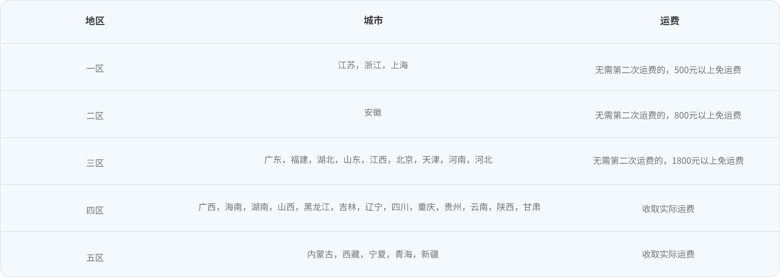2)以上各區(qū)免運費的地區(qū)為盛央非自營物流配送范圍內(nèi)地區(qū),若收貨地址超出所選快遞的配送范圍,我司有可能直接轉(zhuǎn)其他可到達的運輸方式,并另外加收實際運費。